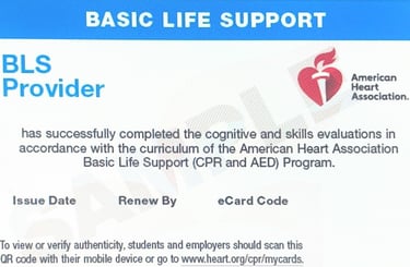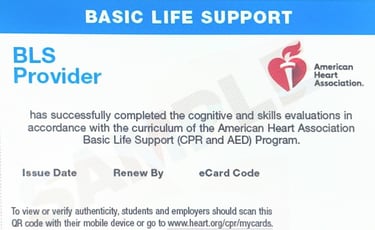 Instruction, hands-on skills and testing are all completed in person. Participants will receive their American Heart Association BLS 2-year card (eCard) and Provider Manual (eBook) via email. The eBook will be accessible for 2 years.